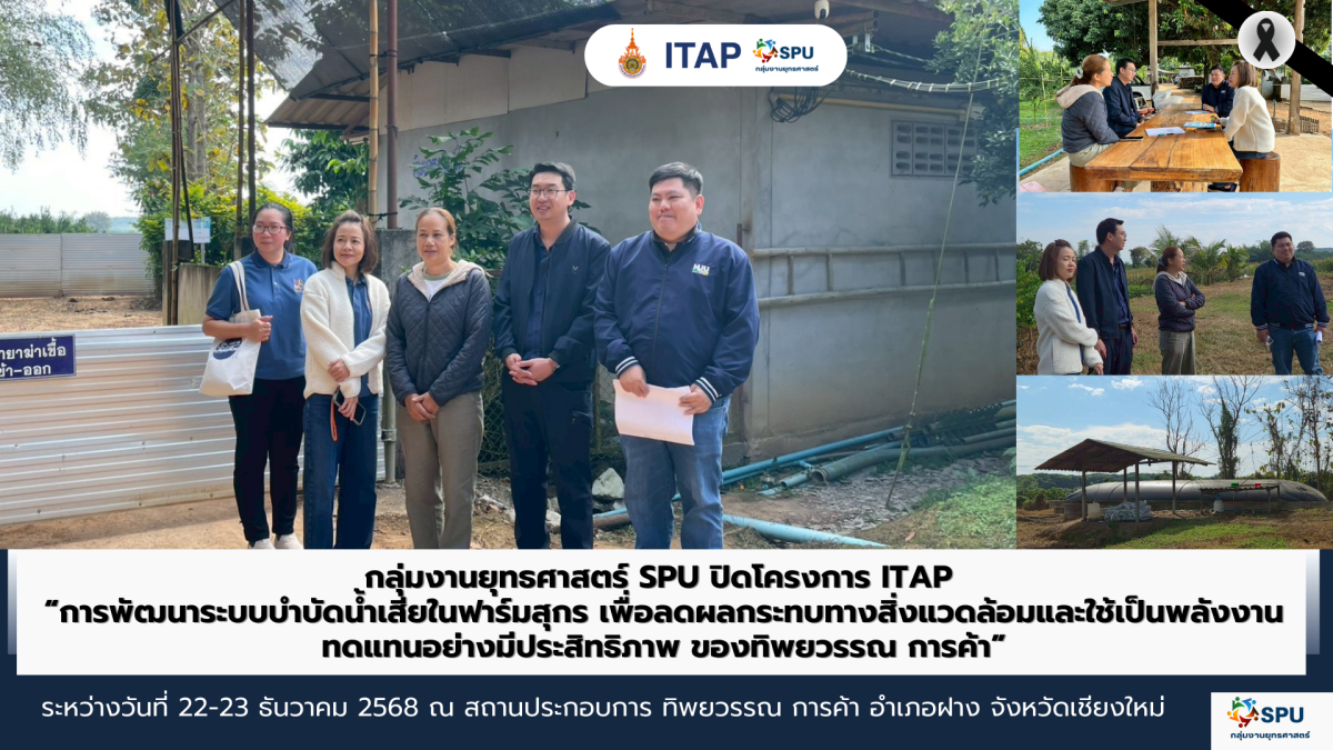กลุ่มงานยุทธศาสตร์ SPU มหาวิทยาลัยเทคโนโลยีราชมงคลล้านนา ในฐานะหน่วยงานเครือข่ายดำเนินงาน โครงการโปรแกรมสนับสนุนการพัฒนาเทคโนโลยีและนวัตกรรม (ITAP) ได้ดำเนินกิจกรรมประเมินปิดโครงการ เรื่อง การพัฒนาระบบบำบัดน้ำเสียในฟาร์มสุกรเพื่อลดผลกระทบทางสิ่งแวดล้อมและใช้เป็นพลังงานทดแทนอย่างมีประสิทธิภาพของทิพยวรรณ การค้า ภายใต้โครงการให้คำปรึกษาเชิงลึกเพื่อยกระดับอุตสาหกรรมในพื้นที่ระเบียงเศรษฐกิจพิเศษและตอบโจทย์อุตสาหกรรมในภูมิภาค ประจำปี 2567-2568 และกิจกรรมการวินิจฉัยปัญหาทางเทคนิคในเบื้องต้นและความต้องการของสถานประกอบการ ระหว่างวันที่ 22-23 ธันวาคม 2568 ณ สถานประกอบการ ทิพยวรรณ การค้า อำเภอฝาง จังหวัดเชียงใหม่